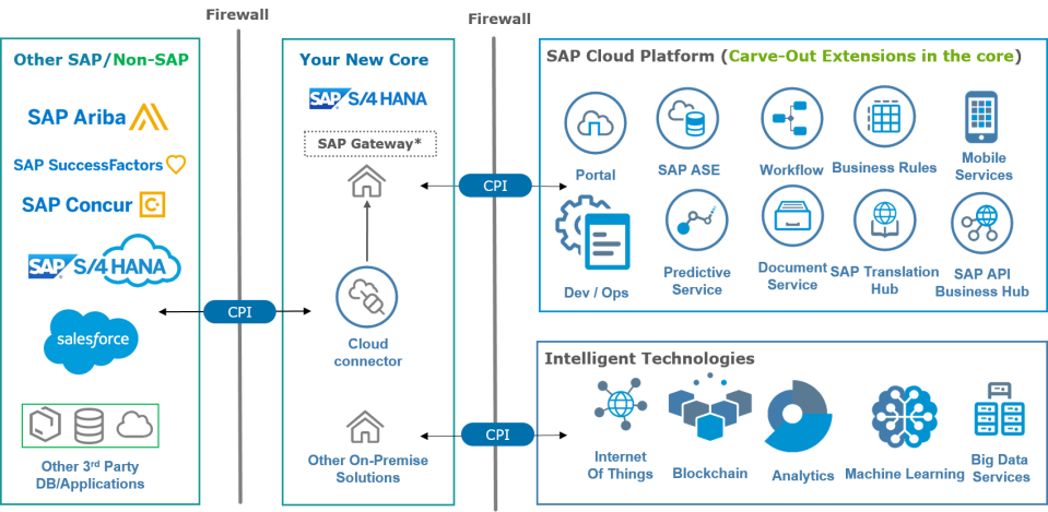 Con SAP S/4HANA, necesitamos cambiar este enfoque. No más cambios en el código estándar ni más desarrollos de aplicaciones pesadas en el núcleo. En su lugar, utilizamos SAP Cloud Platform para ampliar nuestras soluciones. Esto se integra a la perfección con SAP S/4HANA como el núcleo digital y otras soluciones locales/bajo demanda SAP/no-SAP, por lo que mantiene el núcleo limpio.