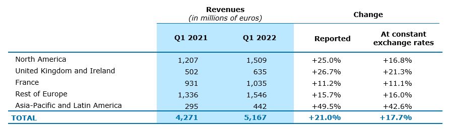 The United Kingdom and Ireland region (12% of the Group revenues in Q1 2022) again enjoyed a particularly robust quarter with revenue growth of +21.3% at constant exchange rates, driven primarily by the Public Sector and Consumer Goods.