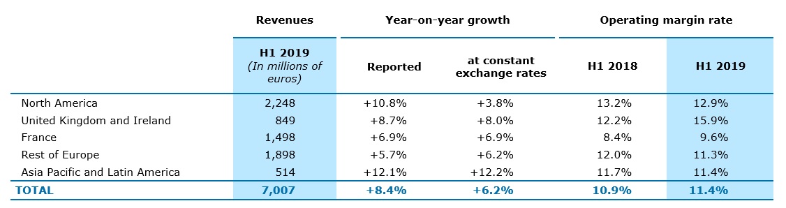 Los ingresos de América del Norte (32% de los ingresos del Grupo) crecieron un 3.8% a tipos de cambio constantes, sobre una base de comparación particularmente alta, ya que el crecimiento de la región alcanzó el 17.2% en el primer semestre de 2018. TMT (Telecomunicaciones, Medios y Tecnología), sectores de Energía y Servicios Públicos, así como el Sector Servicios registraron los impulsos más fuertes. La tasa de margen operativo fue del 12.9%, en comparación con el 13.2% en el mismo período del año anterior.