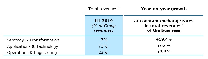 Los servicios de Aplicaciones y Tecnología (71% de los ingresos totales del Grupo), el negocio central del Grupo, reportaron un crecimiento total de los ingresos del 6.6% a tipo de cambio constante. Estos servicios están muy involucrados en proyectos de clientes para el despliegue a gran escala de su estrategia digital.