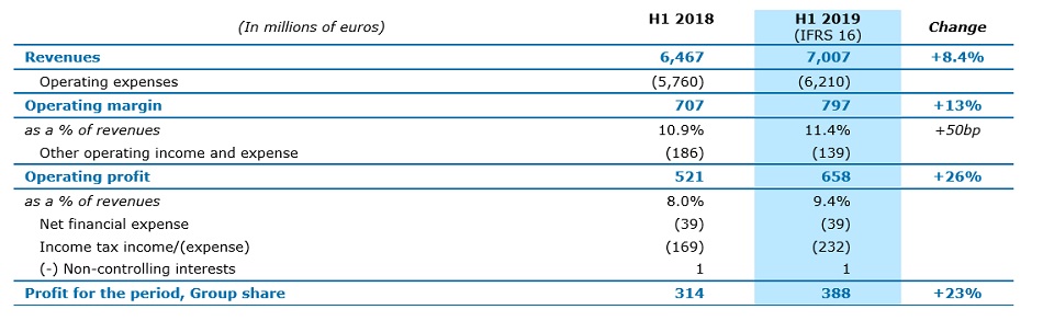 El Grupo generó ingresos de más de €7,007 millones de euros en el primer semestre de 2019, 8.4% más que los ingresos informados en el primer semestre de 2018 y 6.2% a tipos de cambio constante*. El crecimiento orgánico* (es decir, excluyendo el impacto de las fluctuaciones monetarias y los cambios en el alcance del Grupo) fue de 4.9%.
