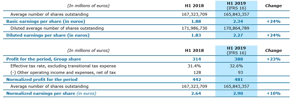 El beneficio neto (participación del Grupo) aumentó 23% interanual a €388 millones de euros durante los primeros seis meses del año. El GPA básico (ganancias normalizadas por acción) ha aumentado un 24% interanual a €2.34. El GPA * normalizado subió un 10% a € 2,90 euros. El GPA normalizado ajustado por el gasto tributario de transición aumentó 12% a €3.08.