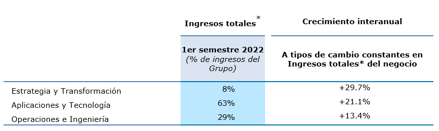 Los servicios de Estrategia y Transformación (8% de los ingresos del Grupo en el primer semestre de 2022) y los servicios de Aplicaciones y Tecnología (63% de los ingresos del Grupo y el negocio principal de Capgemini) continúan beneficiándose de la amplia demanda de transformación digital, registrando un crecimiento en los ingresos totales* a tipos de cambio constantes de +29.7% y +21.1%, respectivamente.