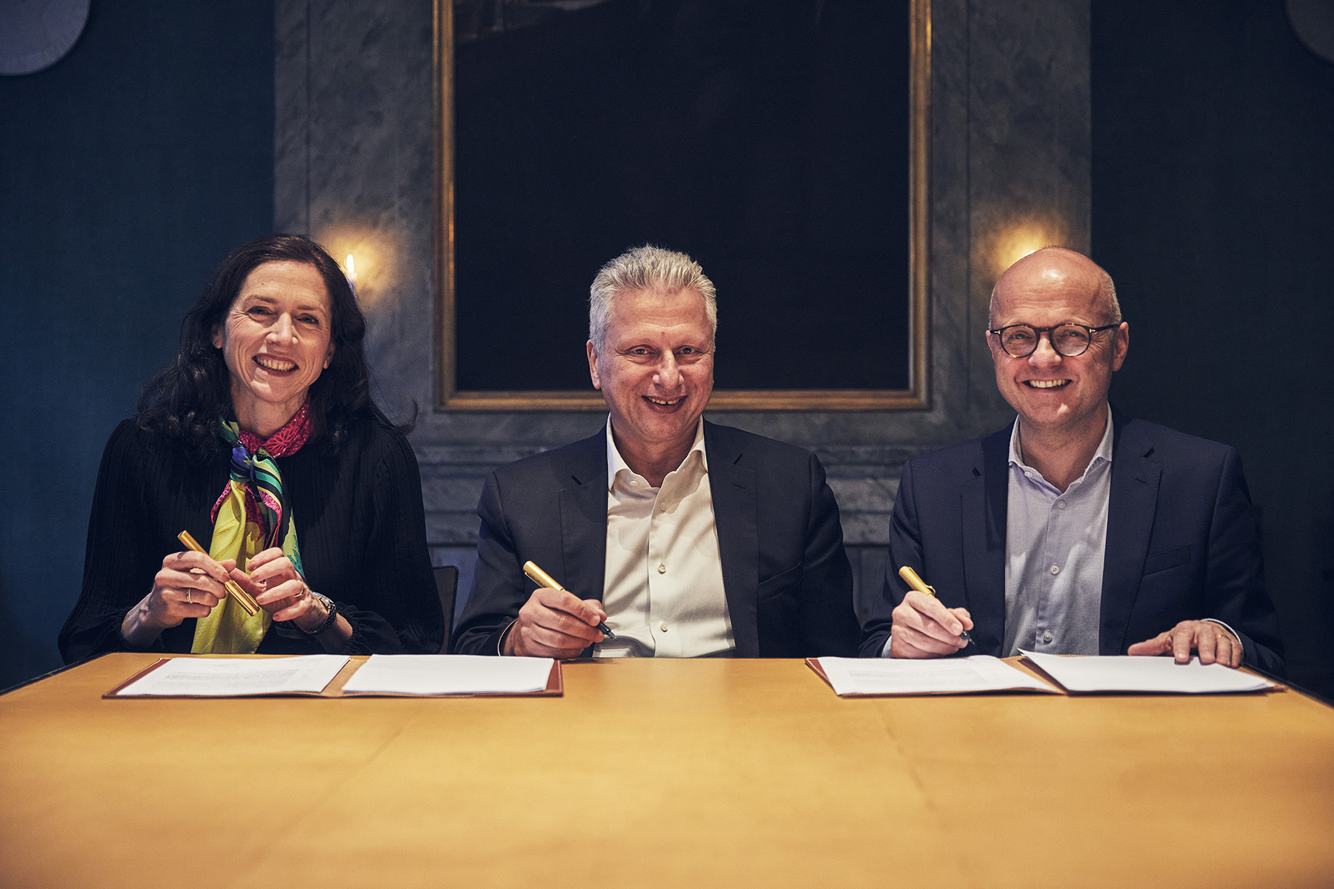 Laura Sprechmann, CEO of Nobel Prize Outreach, Aiman Ezzat, CEO of Capgemini and Vidar Helgesen, Executive Director, Nobel Foundation during the signing of the partnership on November 12, 2021 in Stockholm.