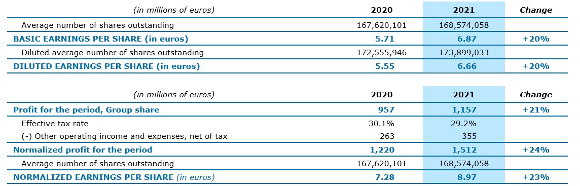 Normalized net profit is equal to profit for the year (Group share) adjusted for the impact of items recognized in “Other operating income and expense”, net of tax calculated using the effective tax rate. Normalized earnings per share is computed like basic earnings per share, i.e. excluding dilution.