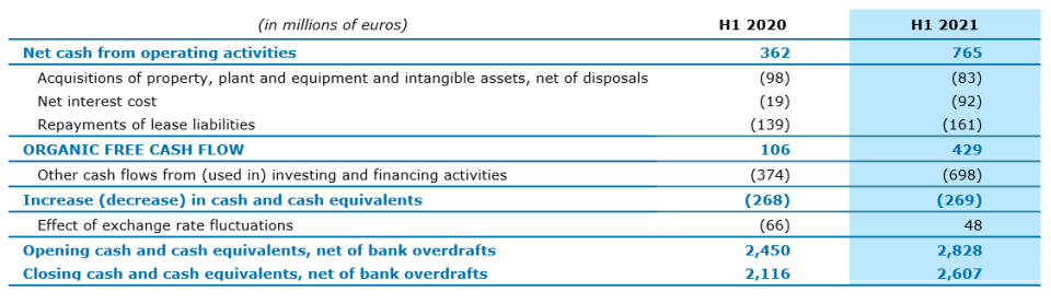 The Group generated organic free cash flow* of €429 million, compared with €106 million in the same period in 2020.
