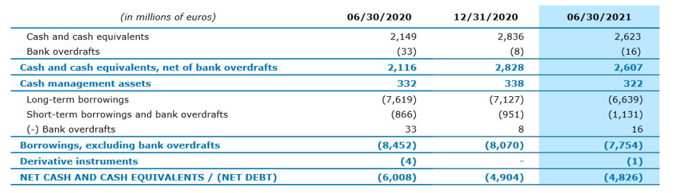 At June 30, 2021, the Group had cash and cash equivalents and cash management assets of €2.9 billion. After accounting for borrowings of nearly €7.8 billion, Capgemini net debt* stands at €4.8 billion at June 30, 2021, compared with €6.0 billion at June 30, 2020 and €4.9 billion at December 31, 2020.