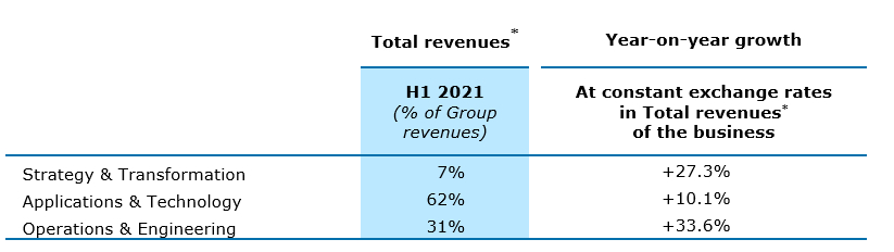For the whole of H1 and at constant exchange rates, Strategy & Transformation consulting services reported a +27.3% rise in total revenues. Applications & Technology total revenues increased +10.1%. Finally, Operations & Engineering total revenues grew +33.6% at constant exchange rates with the Q1 impact of the consolidation of Altran, which mainly delivers Engineering services.