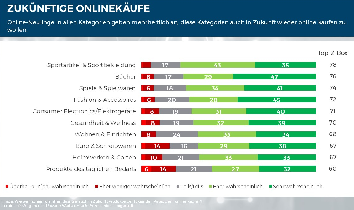 Über die verschiedenen Branchen hinweg gaben die Konsumentinnen und Konsumenten mehrheitlich an, mit den erstmals getätigten Onlinekäufen sehr zufrieden gewesen zu sein. Dabei sehen die befragten Online-Neulinge die Vorteile vom Onlineshopping vor allem in der Lieferung ins Haus (75 %), der Unabhängigkeit von Öffnungszeiten (63 %), sowie der großen Produktauswahl (59 %). Corona-spezifische Vorteile wie eine geringere Ansteckungsgefahr (54 %) und der bequemere, maskenfreie Einkauf (34 %) werden zwar auch genannt, allerdings weitaus seltener: Die Online-Neulinge scheinen den Onlineeinkauf auch unabhängig von Corona schätzen gelernt zu haben.