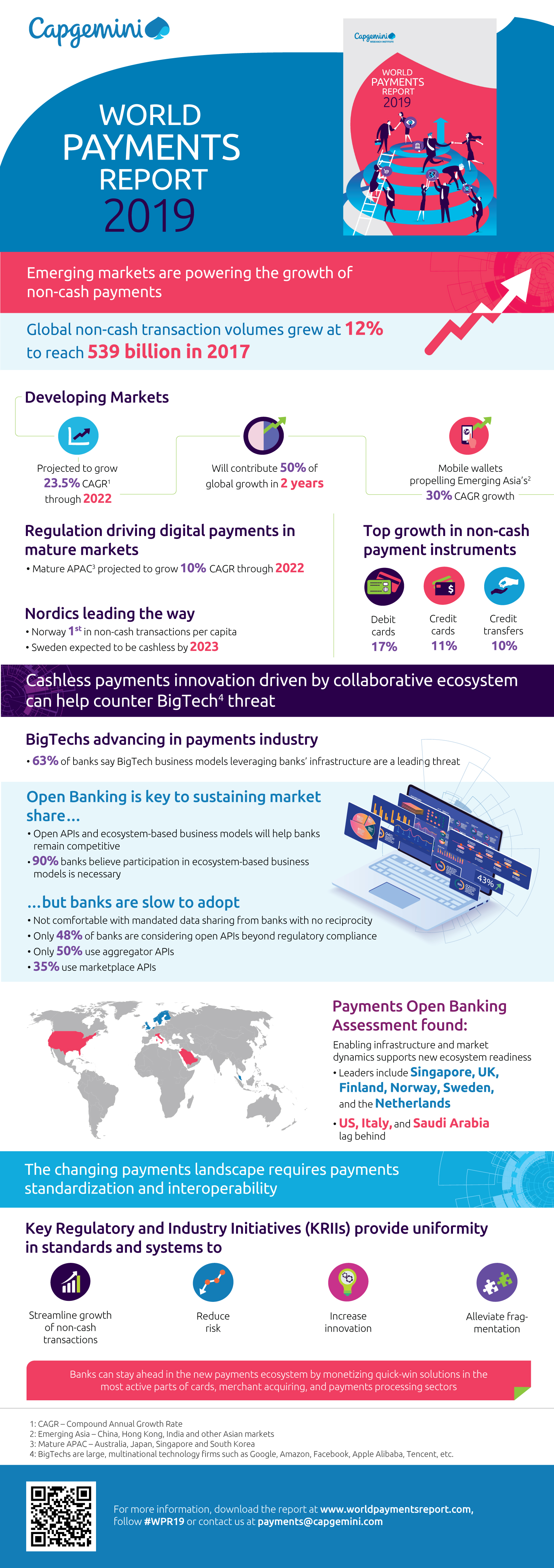 Wien, 17. September 2019 – Während der globale Boom bei bargeldlosen Transaktionen und der Wettbewerb florieren, zögern viele Banken vor dem Open-Banking-Konzept, welches auf Datenaustausch, Ökosystem-Partnerschaften und offenen Plattformen beruht. Sie sehen Open Banking als Herausforderung und gleichzeitig als Notwendigkeit an, um Kunden langfristig zu binden und das Kundenerlebnis zu steigern. Das geht aus dem World Payments Report 2019 von Capgemini hervor, der das bargeldlose Transaktionsvolumen, regulatorische und branchenspezifische Initiativen sowie die digitale Transformation auf dem globalen Zahlungsverkehrsmarkt verfolgt und analysiert.