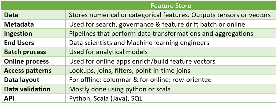 Here below is an enumeration of some important characteristics of feature store technical capability: