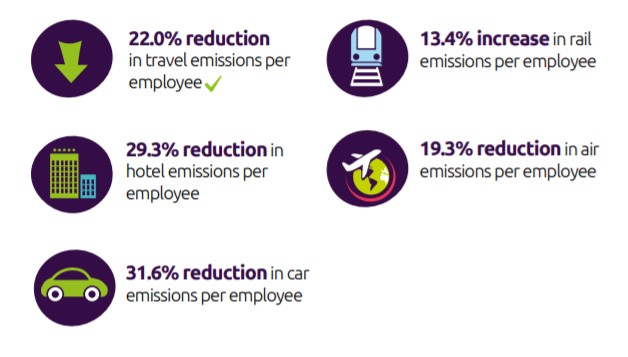 In 2019, Capgemini UK launched a new travel reduction program, to shift our focus from ‘travel’ to how we can better ‘connect’, bringing together virtual collaboration technology with organizational behavior change. Investing in the creation of nine branded physical ‘hub’ spaces across the UK, we enabled geographically dispersed teams to co-collaborate without the need to travel. This has been further supported by new Office365™ solutions deployed in the UK and globally, enabling employee collaboration from any location. The campaign contributed to a 13.3% reduction in business travel emissions in the UK in 2019 alone.