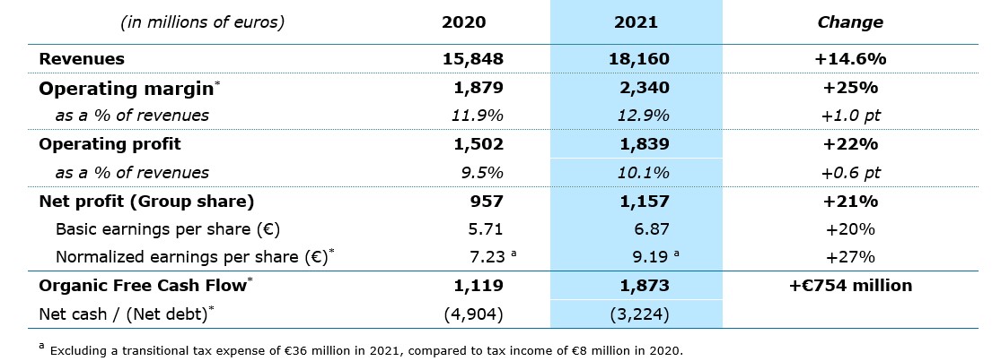 The operating margin* is up by +25% to €2,340 million. At 12.9% of revenues, the margin rate is significantly above the minimum targeted rate of 12.7% as raised last October. This is 1.0 point higher than in 2020 and 0.6 point above the pre-pandemic level (12.3% for fiscal year 2019). This significant increase in the operating margin rate is underpinned by an improvement in the gross margin, supplemented by lower operating expenses driven by the Altran cost synergies and certain cost avoidance in context of the pandemic.