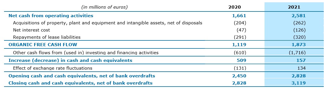 Organic free cash flow* generation totaled €1,873 million, up €754 million on 2020, largely exceeding the €1,700 million target for 2021 as raised twice during the year. This performance primarily reflects the strong growth in Group revenues and the improvement in its operating margin during the year, combined with a marked reduction in working capital.