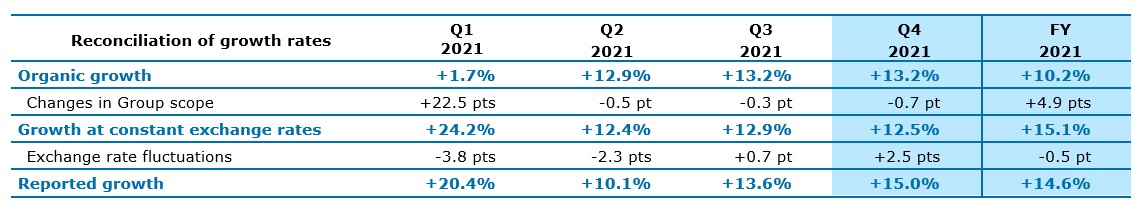 Organic growth or like-for-like growth in revenues is the growth rate calculated at constant Group scope and exchange rates. The Group scope and exchange rates used are those for the reported period. Exchange rates for the reported period are also used to calculate growth at constant exchange rates.