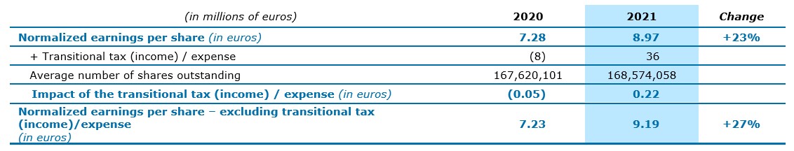 Normalized net profit is equal to profit for the year (Group share) adjusted for the impact of items recognized in “Other operating income and expense”, net of tax calculated using the effective tax rate. Normalized earnings per share is computed like basic earnings per share, i.e. excluding dilution.