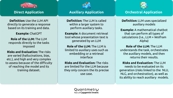 There are three possible applications of Large Language Models’ AI, summarized in Figure 6. The first one is direct application, where the LLM is only used for the tasks that it can perform. This is, a priori, the use case of a chatbot like ChatGPT, which directly implements GPT-4 technology. While this is one of the most common applications, it is also one of the riskiest. This because the LLM often acts like a black box and is difficult to evaluate.