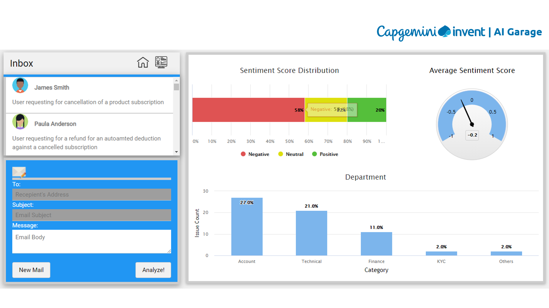 Also, sentiment analysis can exploit the intrinsic “policy emotions” beneath the content and further distinguish the degrees of negativity of complaints. The combination of these two techniques in the NLP field provides government agencies with a quick and accurate way to guide messages to the right department, reducing the workload for human employees and potentially increasing citizens’ satisfaction. The following example is the product of our team within Capgemini which classifies emails and scores their sentiment for the private sector. A similar logic can apply to the public sector as well.