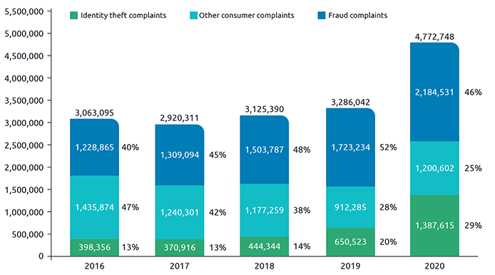 Identity theft complaints (as shown in the bottom layer of the graphic above) increased by roughly 250% in just 5 years, according to the US Federal Trade Commission.