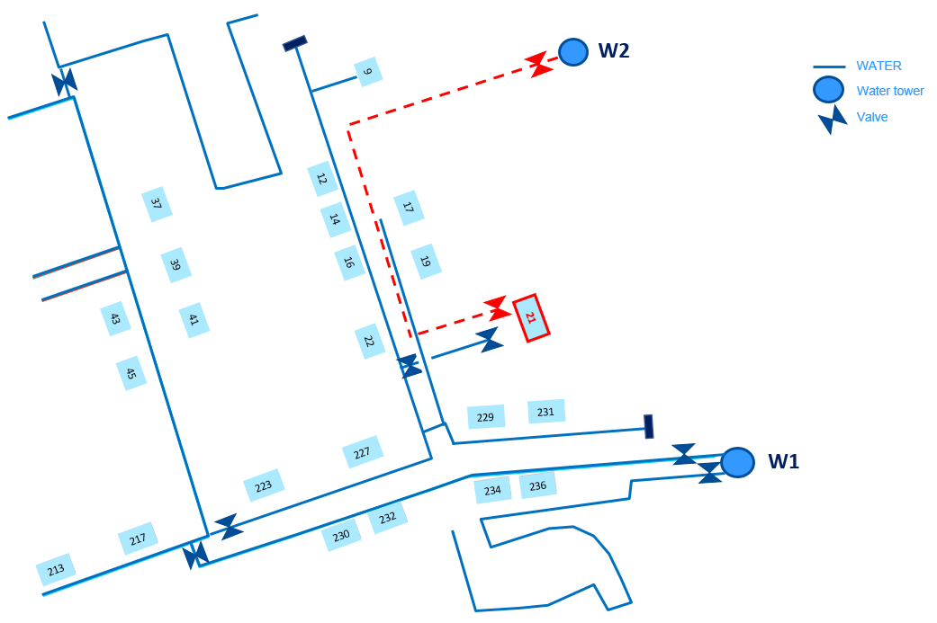 As an example, a water distribution network comprising assets (pipes and nodes) in a residential area as illustrated in the picture. The water distribution company has a strict SLA on one house connection on the right (no 21) and the existing network (blue lines) is insufficiently reliable to meet the SLA requirements. A redundant supply from another water supply (tower W2) is needed and the company decides as an investment project to build the alternative water supply route. They also design it to be the default route, keeping the existing network as the fallback.