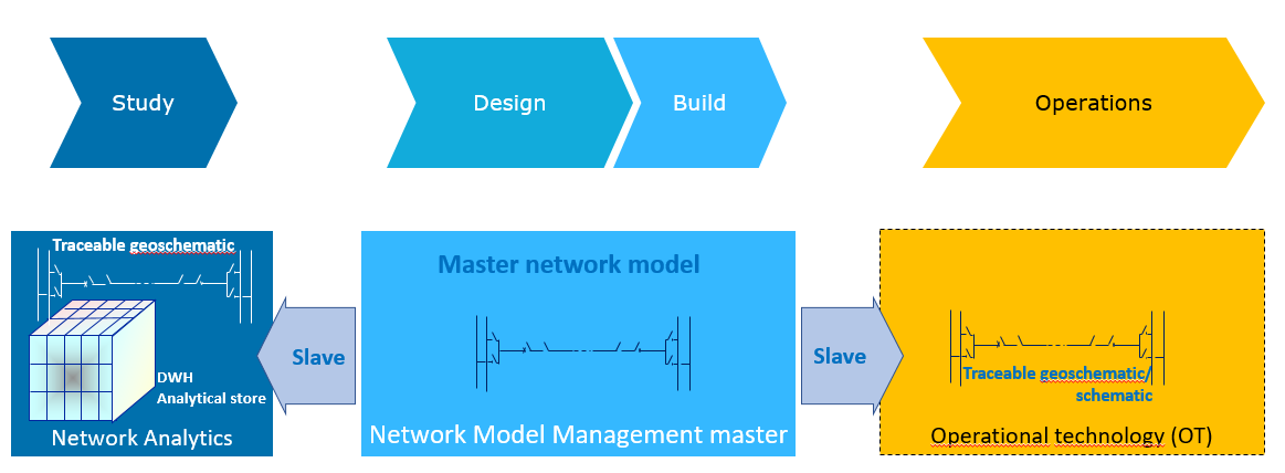 What is the most appropriate information technology to maintain and store the master asset system model? We have to acknowledge the need for a network operator to access different variants of such a model. To improve consistency, a clear master-slave model is recommended, and master-slave information flows should as much as possible follow the natural lifecycle flows of a network modification.