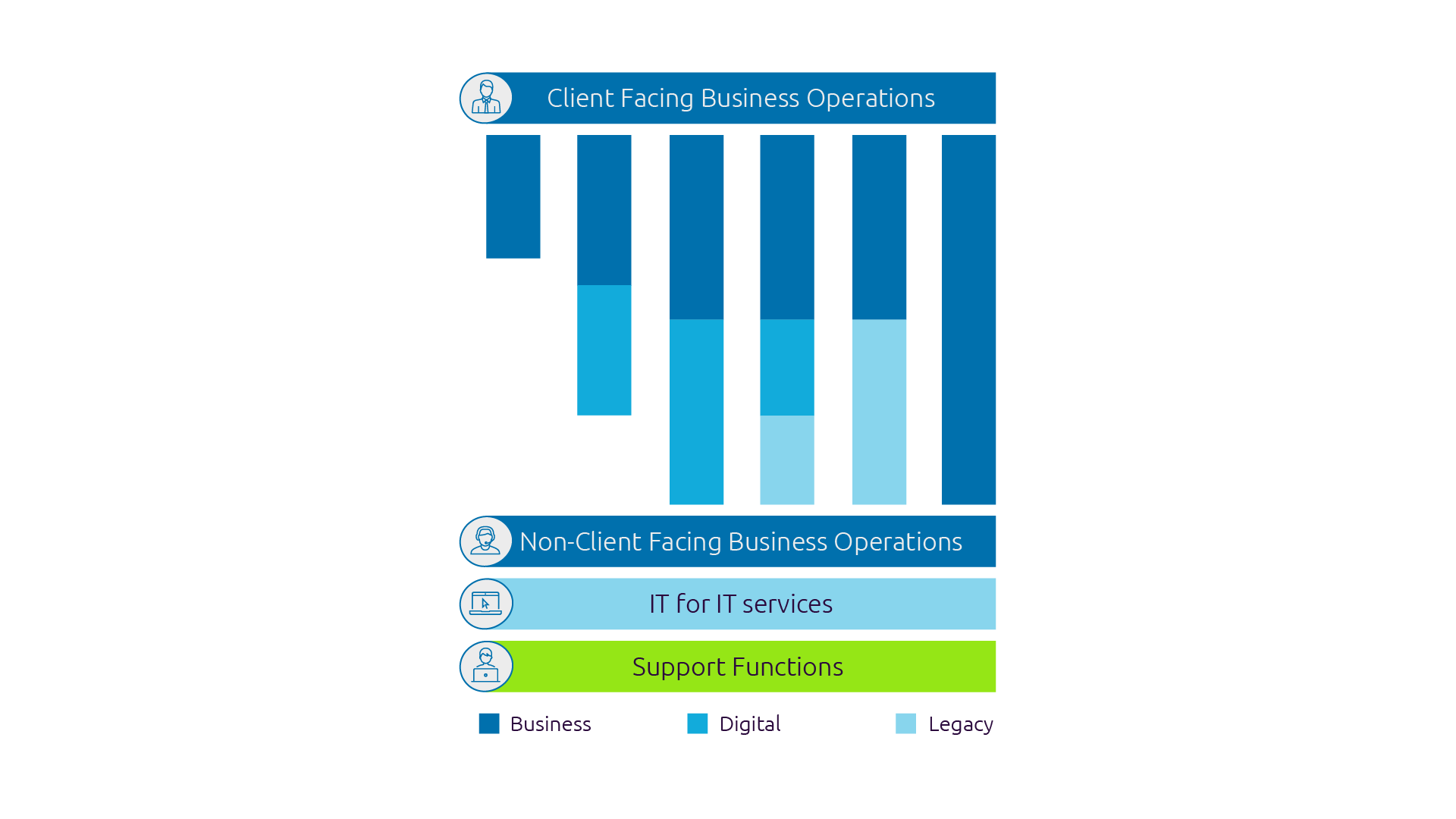 • IT for IT functions and shared IT assets, such as the Helpdesk, IT infrastructure, knowledge management etc. should also be standardized across product verticals to ensure technological consistency across the organization and become more efficient