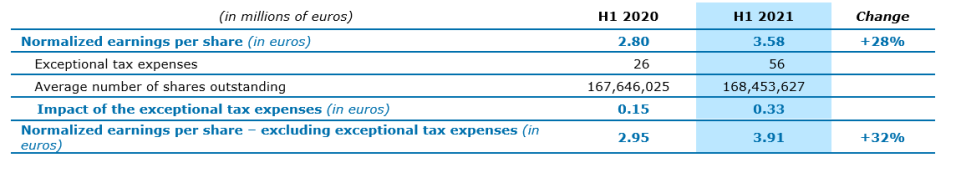 Net profit (Group share) is up 42% year-on-year at €443 million for the first six months of 2021. Basic earnings per share rose by 42% year-on-year to €2.63, while normalized earnings per share* increased 28% to €3.58. Normalized earnings per share adjusted for exceptional tax expenses rose 32% to €3.91.