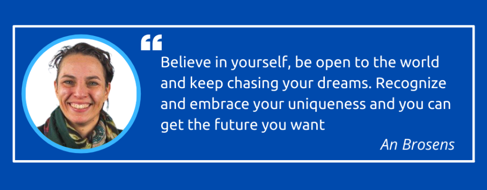 An: I am a proud mother of 3 and I always inspire and motivate my kids to explore technology and how it can change the world around us. Being a professional in the technology sector, I show them the innovative and creative aspects of working in IT and about the diversity of an IT job in terms of working with colleagues in an international context and within different sectors and clients.