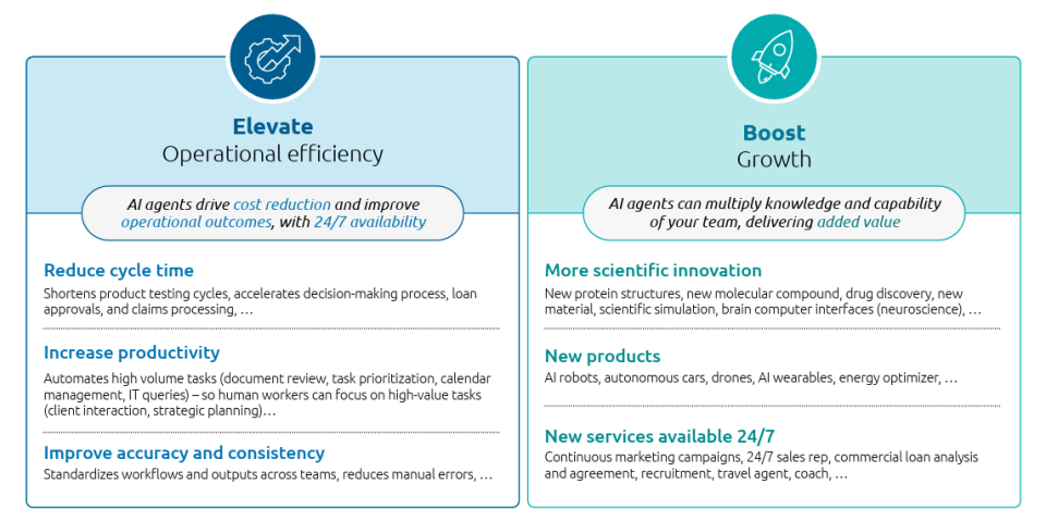 Com a IA Agêntica, entramos em outra fronteira. Conforme descrevemos na pesquisa Rise of Agentic AI, em essência, “os agentes de IA podem gerenciar e executar processos de ponta a ponta de forma proativa, com menos intervenção humana, enquanto os assistentes de IA/IA generativa geralmente atuam como ferramentas focadas em tarefas discretas e predefinidas, baseadas em instruções explícitas”.