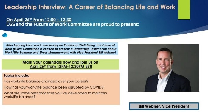 The next event in this series featured Bill Webner, a Vice-President at CGS, who presented a leadership testimonial on work/life balance and stress management. Bill discussed how these topics have changed over the course of his career, how COVID has affected his outlook, and some best practices he’s developed to maintain work/life balance.