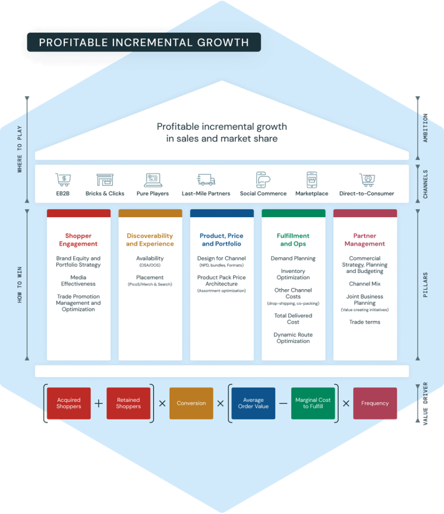 Most CPG companies have an NRM or RGM playbook based on the classic five pillars (brand pack-price architecture, channel/assortment mix, pricing, advertising and promo spend, and trade terms). However, this new game requires a critical update to provide an integrated view across strengthened pillars inclusive of these new digital platforms.