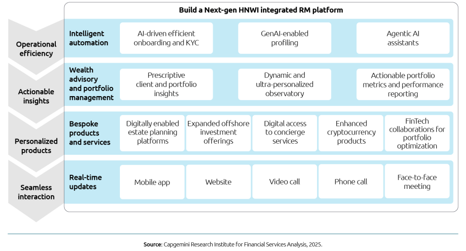 • Embracing artificial intelligence. Ensure your RMs have the latest AI tools, including Generative AI (GenAI) and Agentic AI technologies. Advanced solutions integrate multiple internal and external sources to eliminate manual tasks, provide actionable insights, and generate real-time recommendations for next-best steps, giving RMs space to focus their expertise on strengthening client bonds.