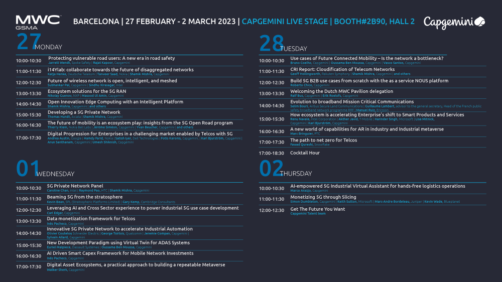 Join us at Mobile World Congress 2023 and explore what happens when powerful new technologies connect. As a partner in business-tech transformation, Capgemini helps Communication Service Providers (CSPs), Network Equipment Providers (NEPs) and all connected industries anticipate future trends and build a comprehensive set of capabilities in support of your goals.