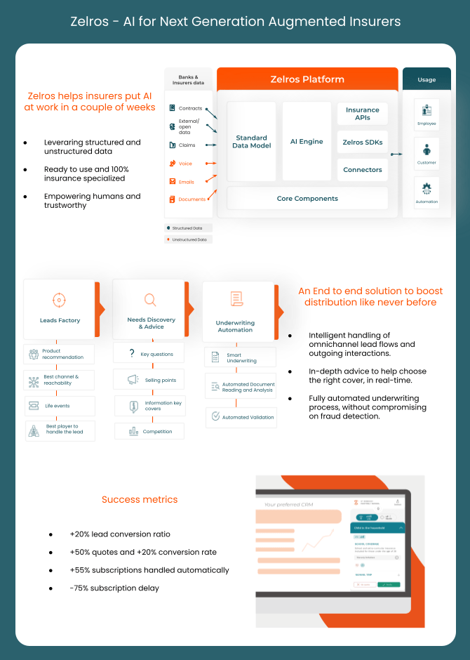 The startup has developed a 100% insurance specialized AI platform that connects to all types of insurance data, whether structured or unstructured such as voice calls or documents to insurance-specific predictive models in order to enrich their predictions and recommendations.