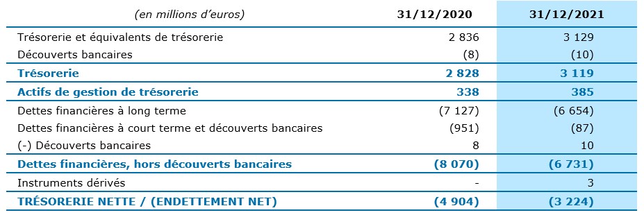 Au 31 décembre 2021, le Groupe dispose à son bilan d’une trésorerie et d’actifs de gestion de trésorerie pour un montant total de 3,5 milliards d’euros. Compte tenu de la dette financière de 6,7 milliards d’euros et des instruments dérivés, l’endettement net du Groupe s’inscrit en réduction sensible à 3,2 milliards d’euros au 31 décembre 2021 contre 4,9 milliards d’euros un an plus tôt.