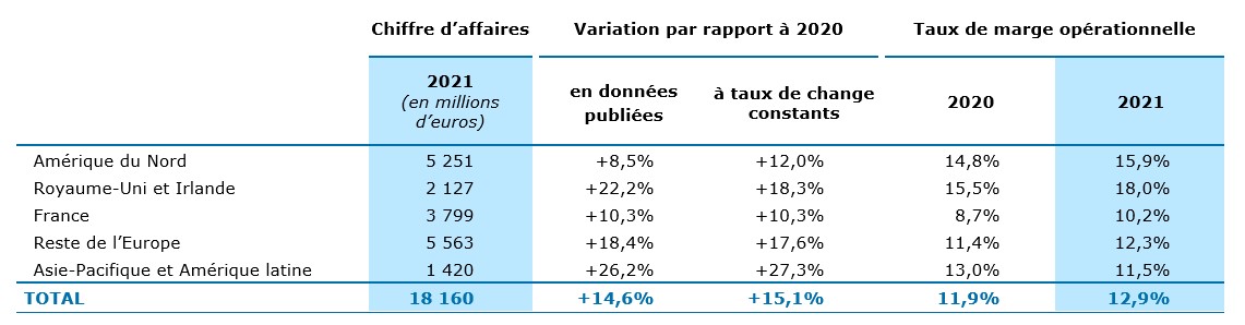 Le chiffre d’affaires de la région Amérique du Nord (29% du chiffre d’affaires du Groupe) progresse de +12,0% à taux de change constants, porté principalement par la dynamique du secteur des TMT (Télécoms, Média et Technologie), des Biens de consommation et de l’Industrie. Le taux de marge opérationnelle poursuit son amélioration et atteint 15,9% contre 14,8% en 2020.
