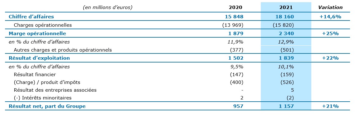 La marge opérationnelle progresse de +25% à 2 340 millions d’euros, soit un taux de 12,9% du chiffre d’affaires, sensiblement supérieur au taux minimum visé, tel que relevé en octobre dernier, de 12,7%. Outre une progression de 1,0 point par rapport à 2020, ce taux est supérieur de 0,6 point au niveau de marge opérationnelle dégagé avant la pandémie (12,3% pour l’exercice 2019). Cette augmentation significative du taux de marge opérationnelle repose sur une amélioration de la marge brute, complétée par l’effet sur les coûts d’exploitation des synergies de coûts dégagées suite à l’intégration d’Altran et la baisse de certaines dépenses d’exploitation dans le contexte de la pandémie.