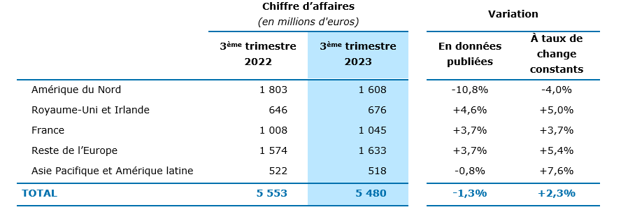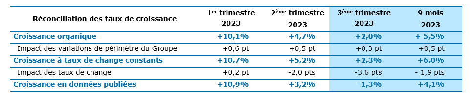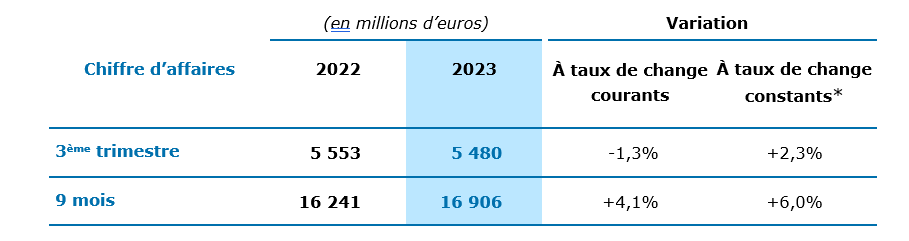 • Chiffre d’affaires de 5 480 millions d’euros au 3ème trimestre 2023, en croissance de +2,3% à taux de change constants*