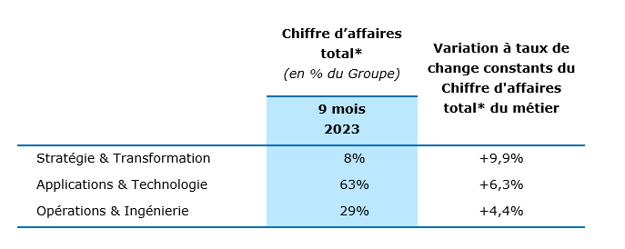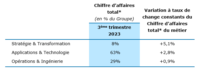 Les services en Stratégie & Transformation (8% du chiffre d’affaires total* du Groupe au 3ème trimestre 2023) conservent une croissance solide, avec une progression de leur chiffre d’affaires total de +5,1% à taux de change constants par rapport au 3ème trimestre 2022.