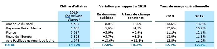 Conformément aux anticipations du Groupe, l’activité s’est contractée dans la région Royaume Uni & Irlande (- 3,1%) dans un contexte d’attentisme marqué, entretenu par les élections générales intervenues en décembre et l’imminence du Brexit. Le chiffre d’affaires s’inscrit en léger recul en Amérique du Nord (-0,4% à taux de change constants). La région Asie-Pacifique et Amérique Latine a maintenu son rythme de croissance à deux chiffres sur les derniers mois de l’année (+10,3%). La région Reste de l’Europe a enregistré une croissance toujours robuste de 6,3%, et la France est restée solide avec une progression de 4,5% de son chiffre d’affaires.