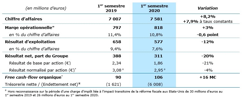 Les estimations que le Groupe a communiquées le 28 juillet 2020 sur ses principaux indicateurs financiers pour le 1er semestre de l’année sont en ligne avec les résultats présentés ce jour :