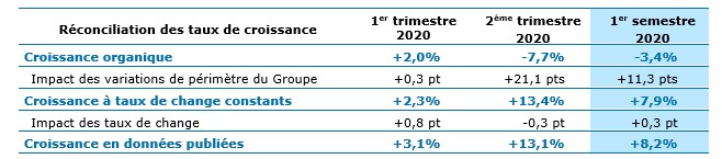 Sur le plan géographique, la croissance organique du 2ème trimestre a enregistré en France un ralentissement très marqué par rapport au rythme du 1er trimestre. Ainsi en dépit de la bonne dynamique du début d’année, la France a été, au 2ème trimestre, la région du Groupe ayant enregistré le plus fort recul en termes de croissance organique. A l’inverse, les régions Amérique du Nord, Royaume-Uni et Irlande et Asie-Pacifique et Amérique latine ont comparativement bien mieux résisté avec des croissances organiques au 2ème trimestre plus proches de celles du début d’année. Cette disparité peut être attribuée aux différences observées dans la durée et la rigueur des périodes de confinement et le mix sectoriel des différents pays.