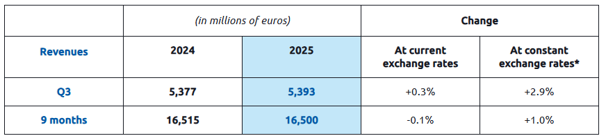 - Q3 2025 revenues of €5,393 million, up +2.9% at constant exchange rates*