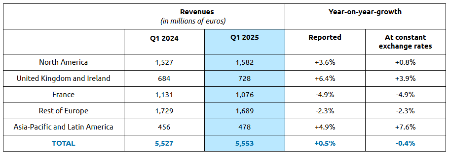 At constant exchange rates, revenues in North America (28% of 2024 Group revenues) were back to slight growth in Q1, up +0.8% year-on-year. This performance was mostly driven by the TMT (Telecoms, Media and Technology) and Financial Services sectors, and partly offset by a decline in the Manufacturing sector.