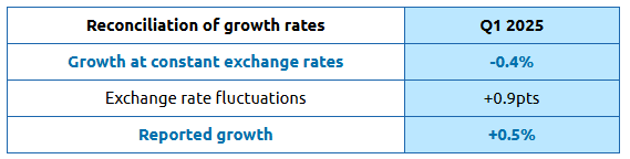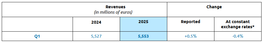 - Q1 2025 revenues of €5,553 million, up +0.5% at current exchange rates and a decline limited to -0.4% at constant exchange rates*