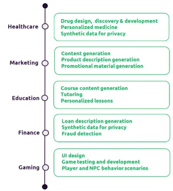 Comenzando con la aplicación de texto más común, que funciona con modelos GPT y GAN. Incluyendo todo, desde la generación de texto hasta el resumen y la creación de contenido personalizado, estos pueden usarse en educación, atención médica, marketing y la vida cotidiana. El componente de aplicación conversacional de la aplicación de texto se usa en chatbots y asistentes de voz.
