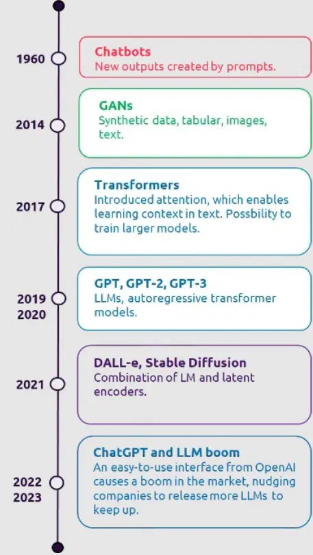 Antes de exponer nuestros problemas de confianza, demos un paso atrás y expliquemos qué significa esta nueva era de IA generativa. Los modelos generativos son modelos de aprendizaje profundo que crean nuevos datos. Sus predecesores son Chatbots, VAE, GAN y modelos NLP, con una arquitectura que puede crear nuevos puntos de datos basados en los datos originales que se usaron para entrenarlos, y hoy, ¡podemos hacer todo esto en base a en sólo un mensaje de texto!