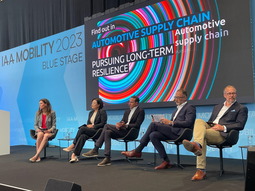 Discussing automotive supply chain resilience at the IAA Mobility event with (left to right) Vera Schneman, Shan Liu of Aurobay, Oliver Ganser of BMW Group, me, and Christian Michalak of Capgemini Invent. Watch the panel discussion in full.