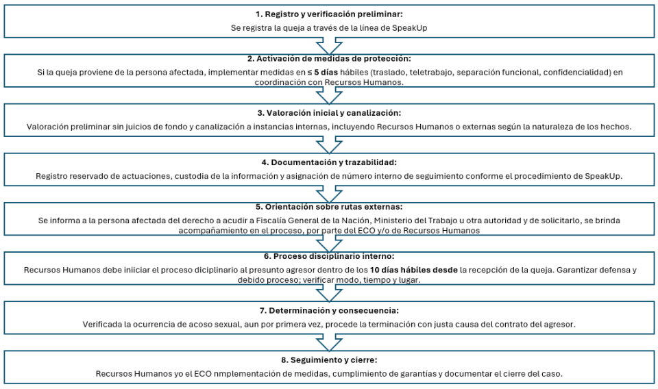 • 10.8. Seguimiento y cierre. El Gerente de Recursos Humanos y/o el ECO realizarán el seguimiento a la implementación de medidas, verificarán el cumplimiento de garantías y documentarán el cierre del caso, dejando constancia de las actuaciones realizadas y de las decisiones adoptadas.