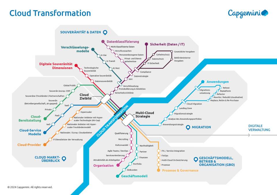 Der „Liniennetzplan“ skizziert die Fülle an Themenbereichen und Fragestellungen auf der Reise in die Cloud. Nördlich des Flusses sind die Grundlagen und Elemente zur Entwicklung der Cloud-Strategie, südlich ist die Umsetzung angesiedelt. Nicht für jeden Kunden ist alles gleich relevant; man beginnt an unterschiedlichen Haltestellen die Reise und nimmt verschiedene Strecken.